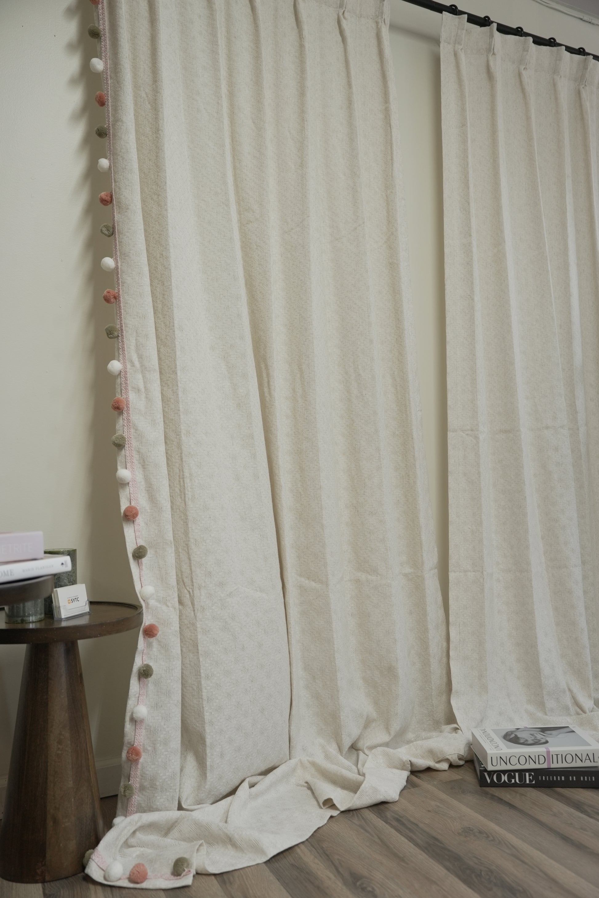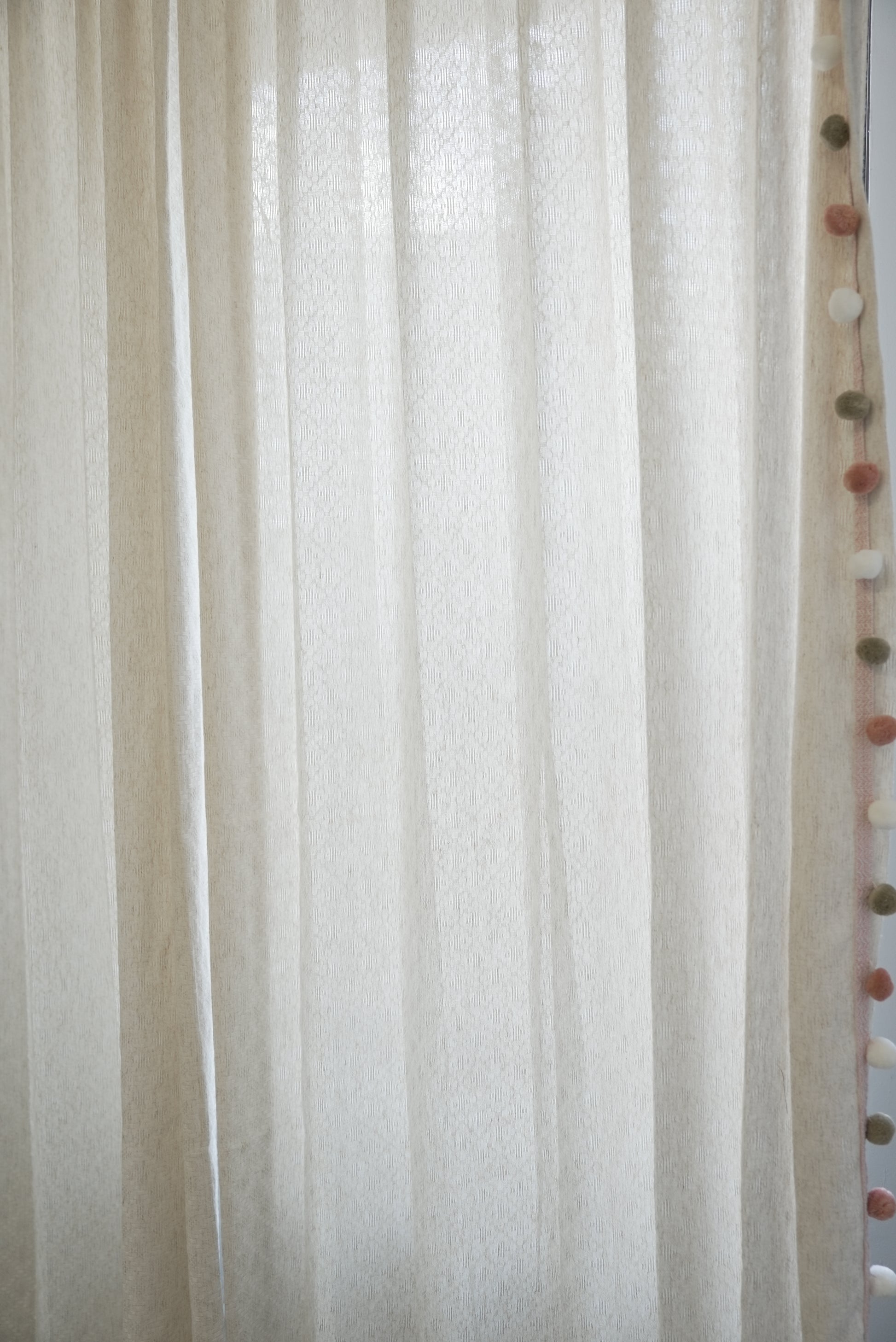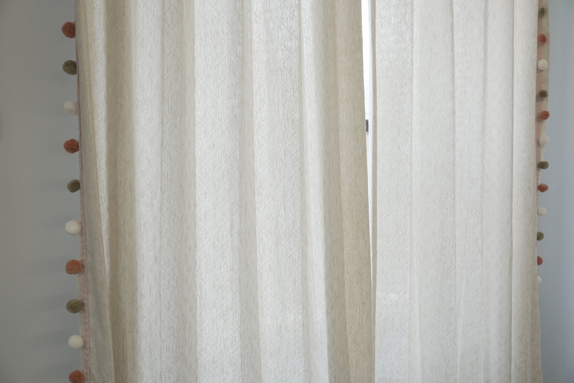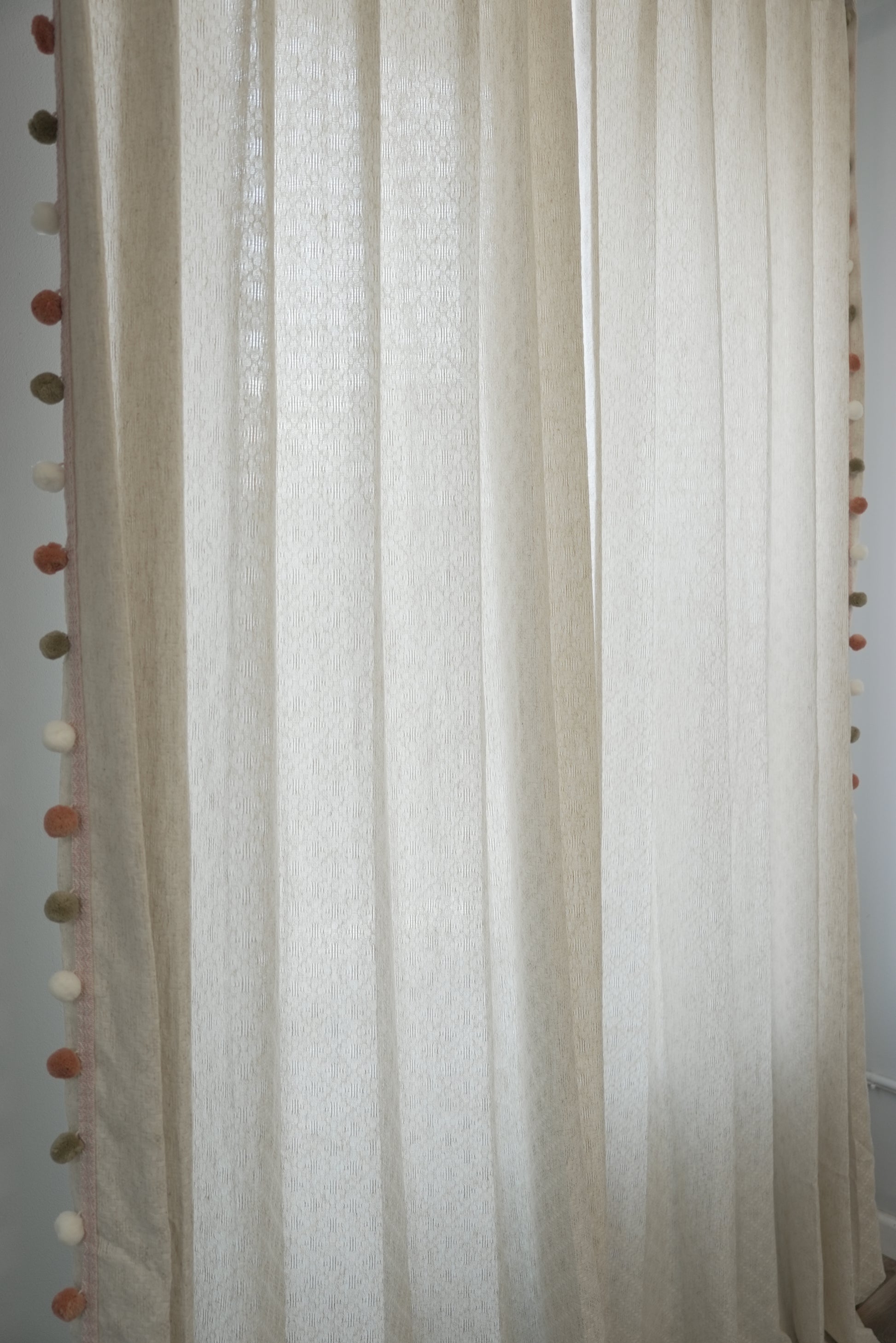Elevate your windows with understated elegance featuring these luxurious beige linen-blend sheers adorned with handcrafted pom pom trim in sophisticated Morandi hues of white, soft orange, and sage green. Perfect for design enthusiasts seeking organic texture with playful sophistication in boho, Japandi, or modern farmhouse spaces.