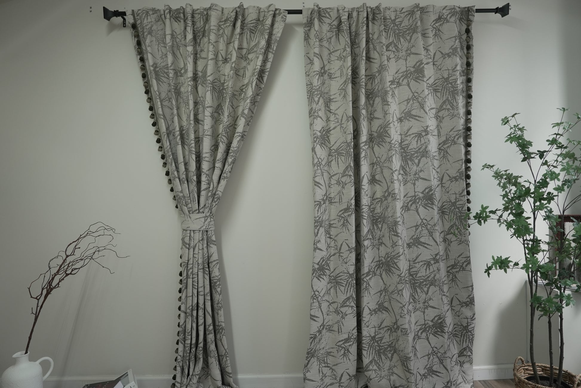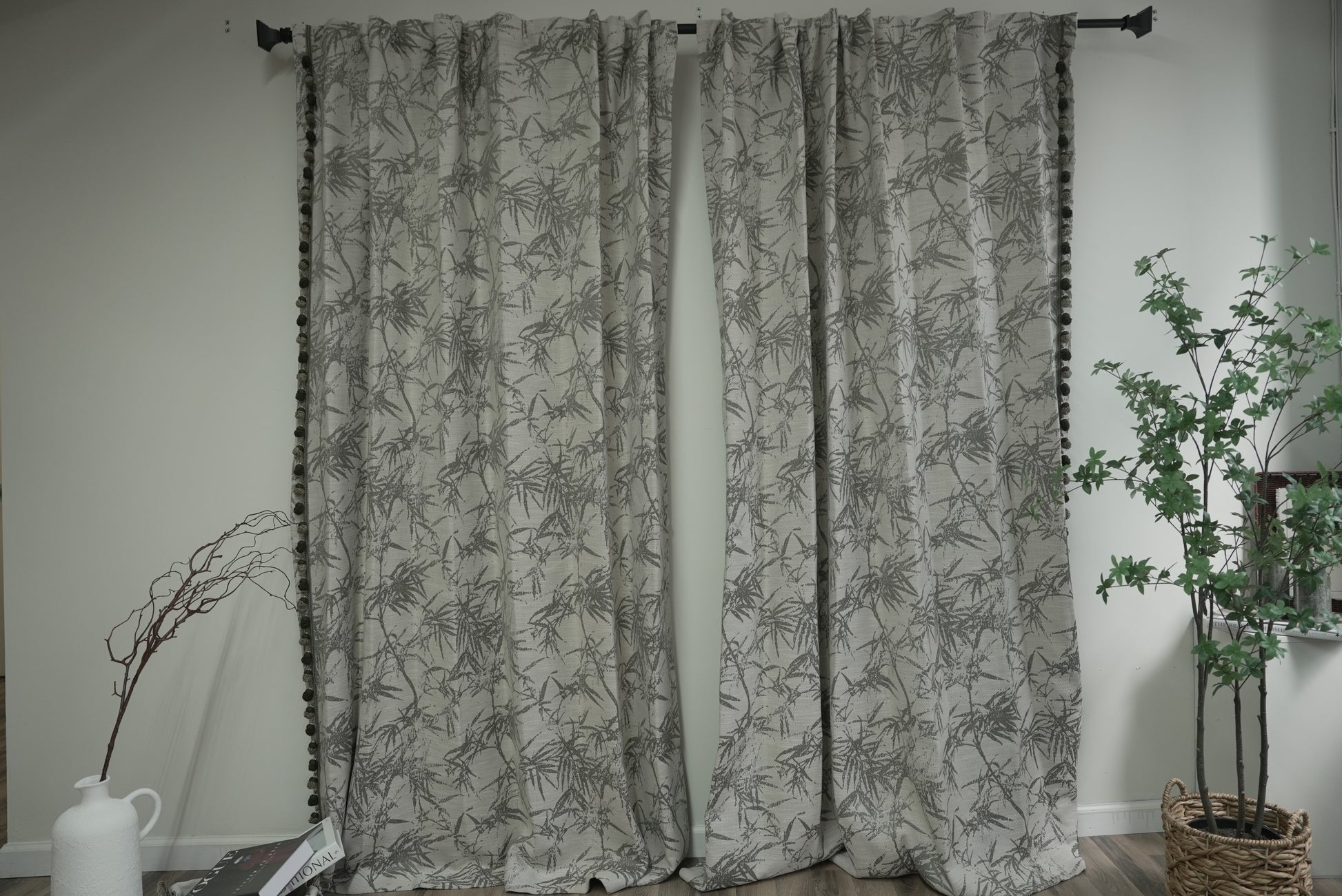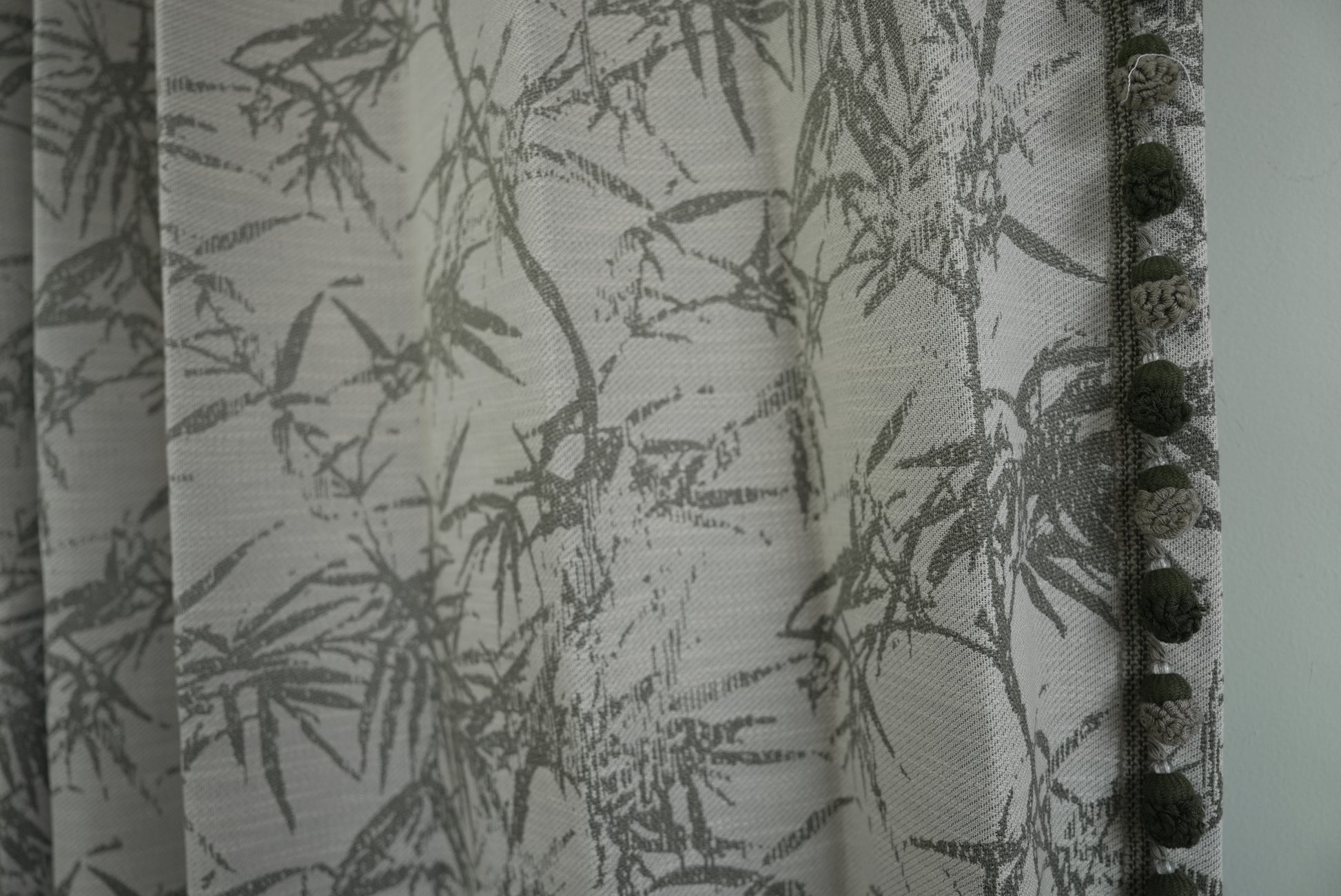 Green Retro Bamboo Pattern Curtains with Pom Pom Trim - Tropical Boho Drapes
